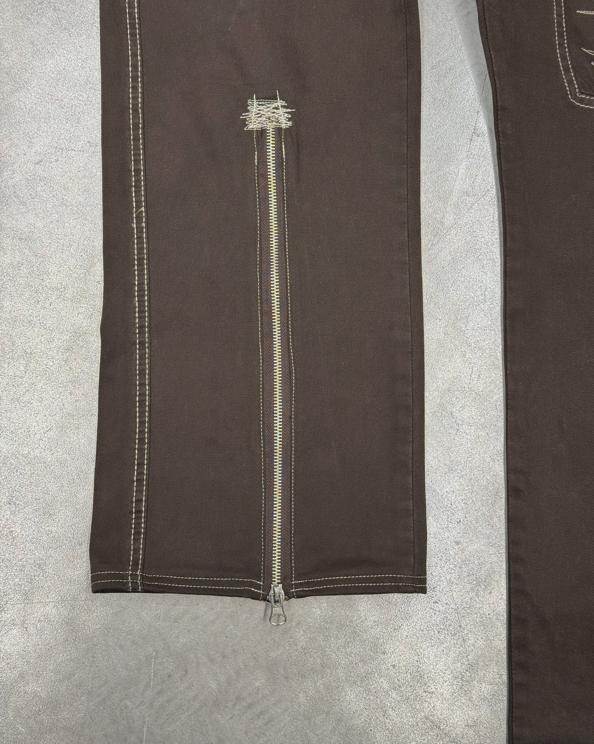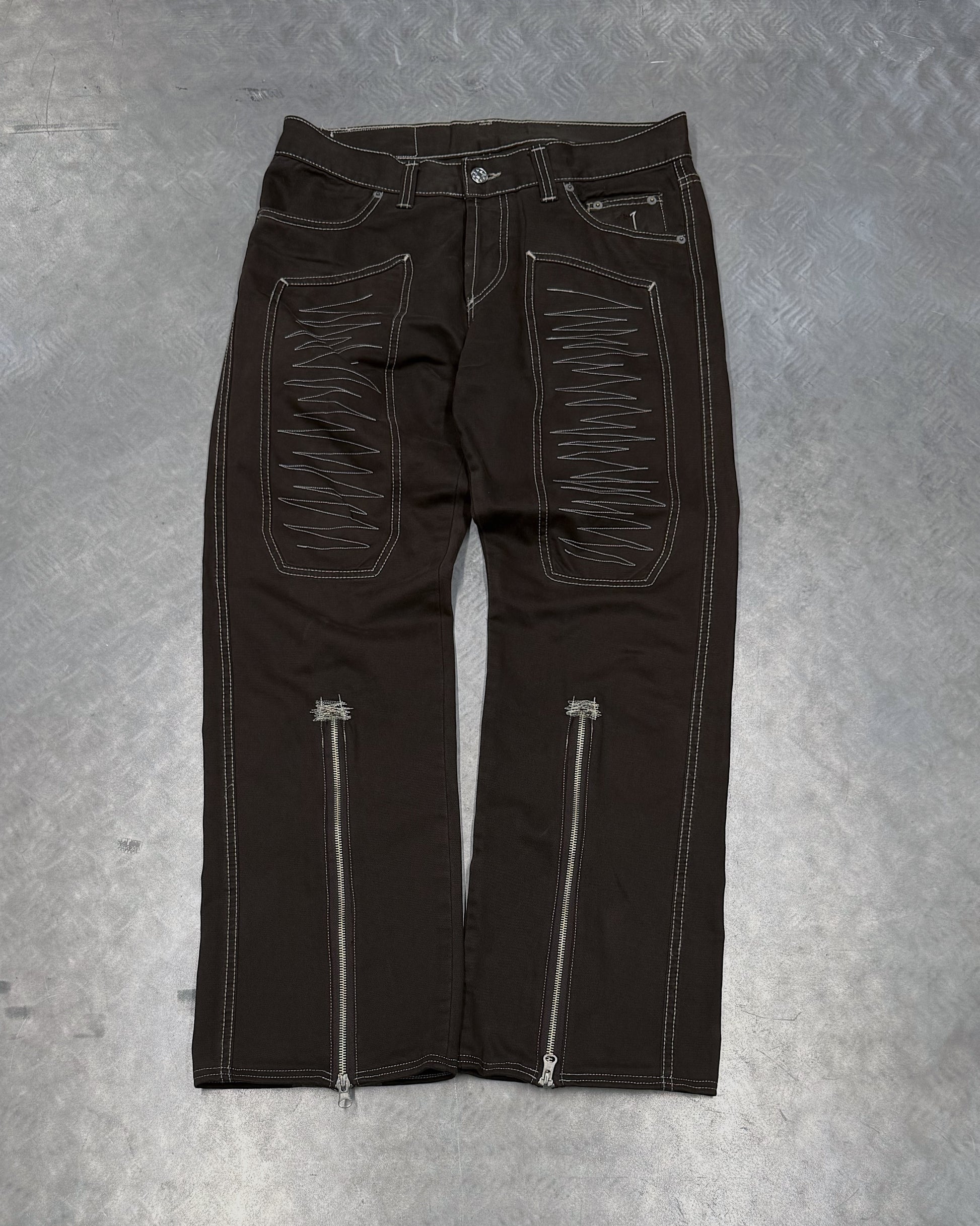 Elevate your everyday style with the Earth Vein Upcycled Vintage Pants — upcycled piece crafted from durable, pre-loved brown denim. Uniquely reworked with hand-stitched contrast detailing that flows down the leg in an organic, vein-like pattern, giving a raw, artistic texture that feels natural and expressive. The zippers at the bottom can open up changing pants fit to flared from straight. The straight-leg cut and classic multi-pocket structure keep the fit timeless and wearable, while the distressed finish and subtle cross-stitch patch accent highlight slow-fashion craftsmanship and sustainable intent. Perfect for those who embrace authentic vintage character with an eco-conscious core.