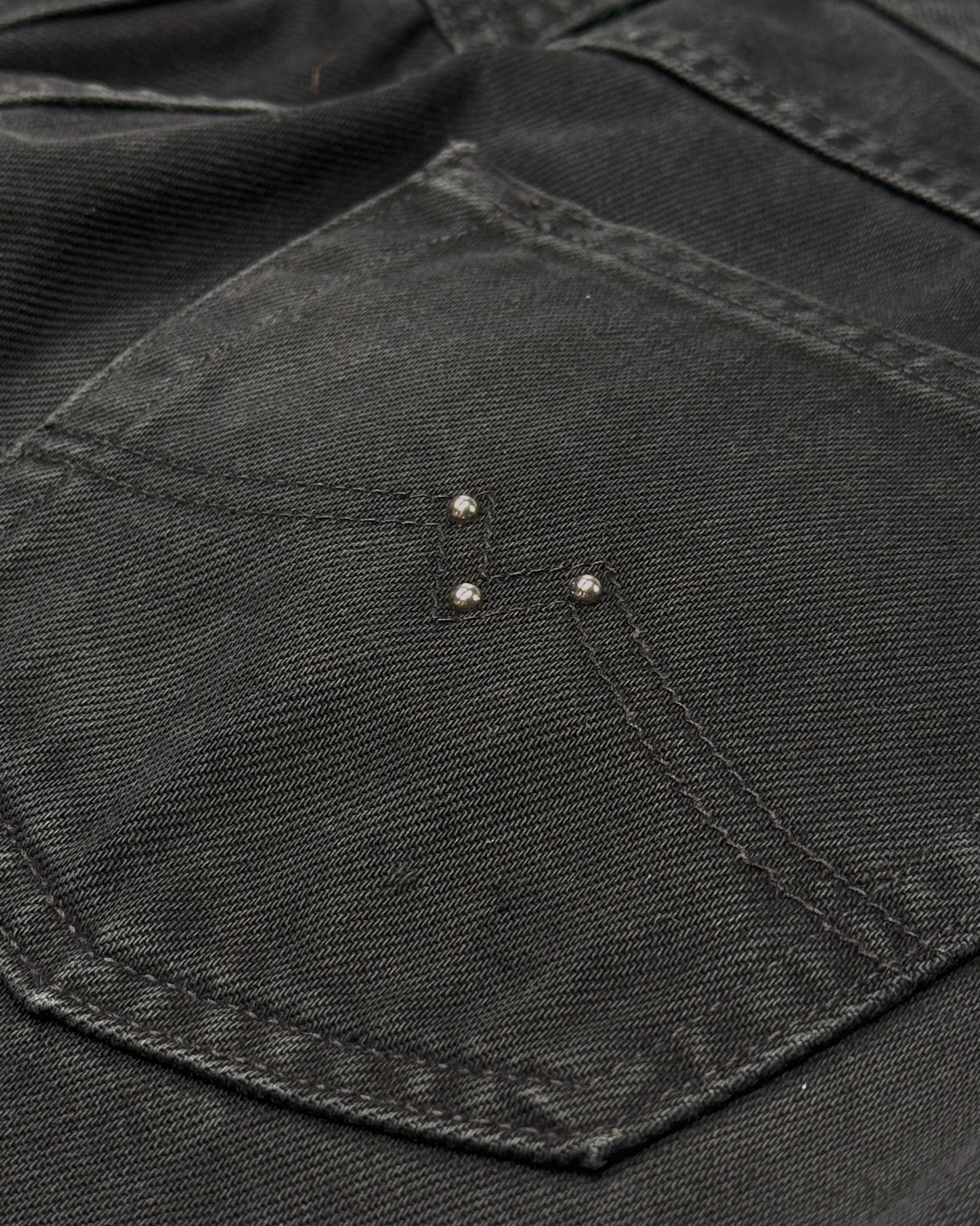 • Upcycled from 100% reclaimed vintage denim • Hand-washed graphite/ink pigment treatment • Reconstructed front panel with layered, frayed denim