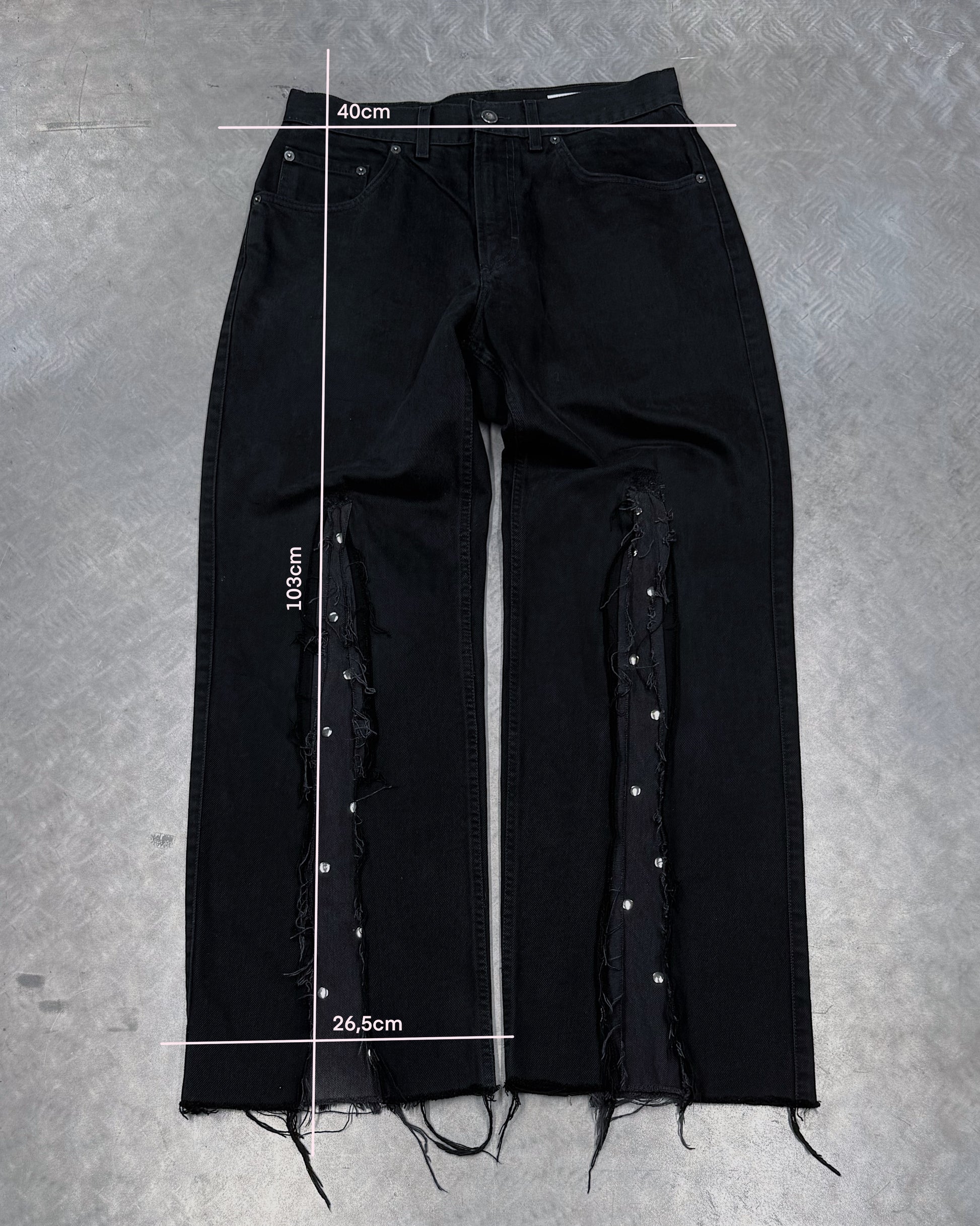 Turn heads with the Ink Trail Hand-Reworked Vintage Jeans — a one-of-a-kind upcycled piece crafted from reclaimed denim and finished with an expressive graphite-black wash. The pair features a dramatic hand-distressed front panel with layered denim strips, raw fraying, and irregular textures that create depth and sculptural character. Perfect for those who want bold, artistic denim with authentic vintage attitude.