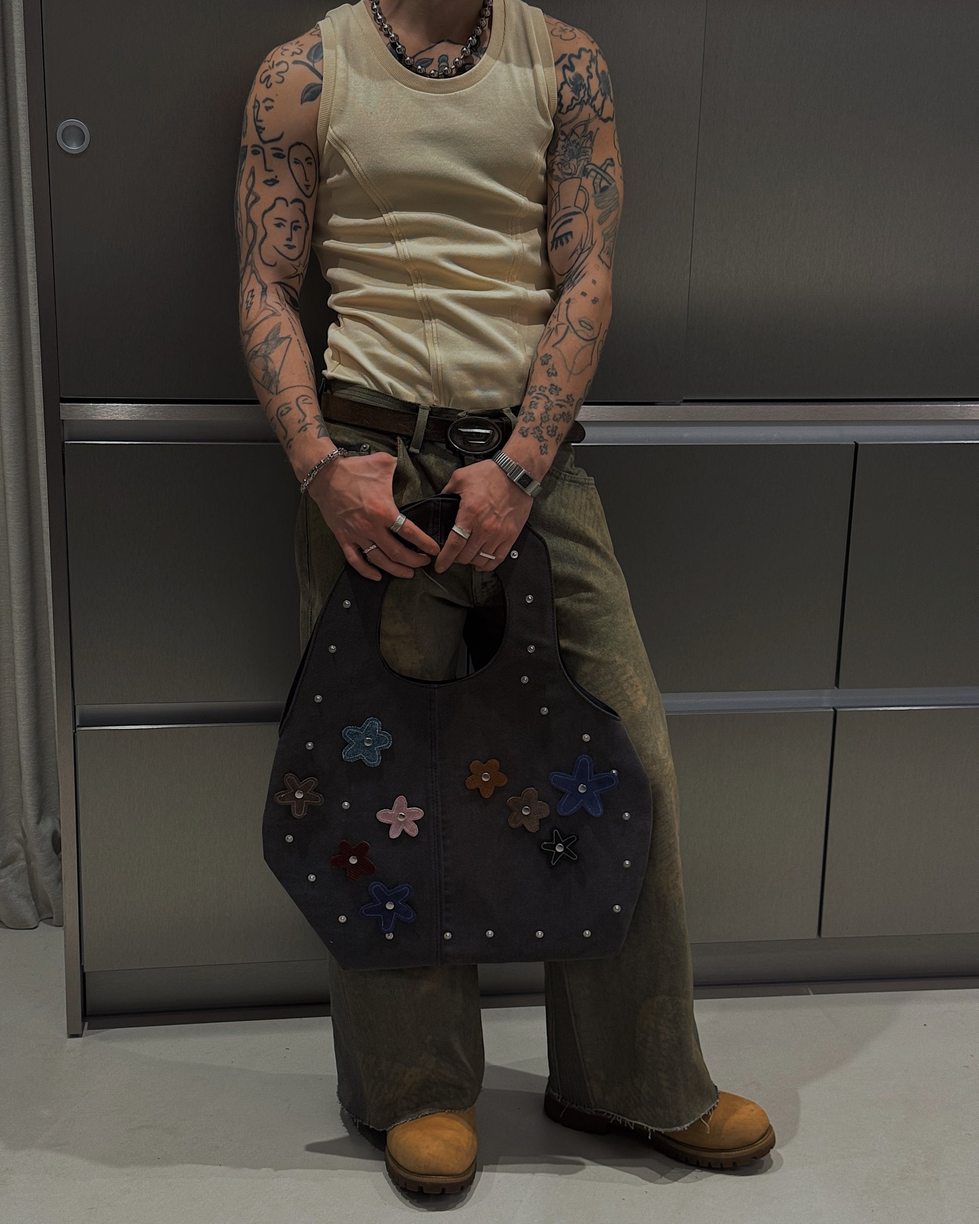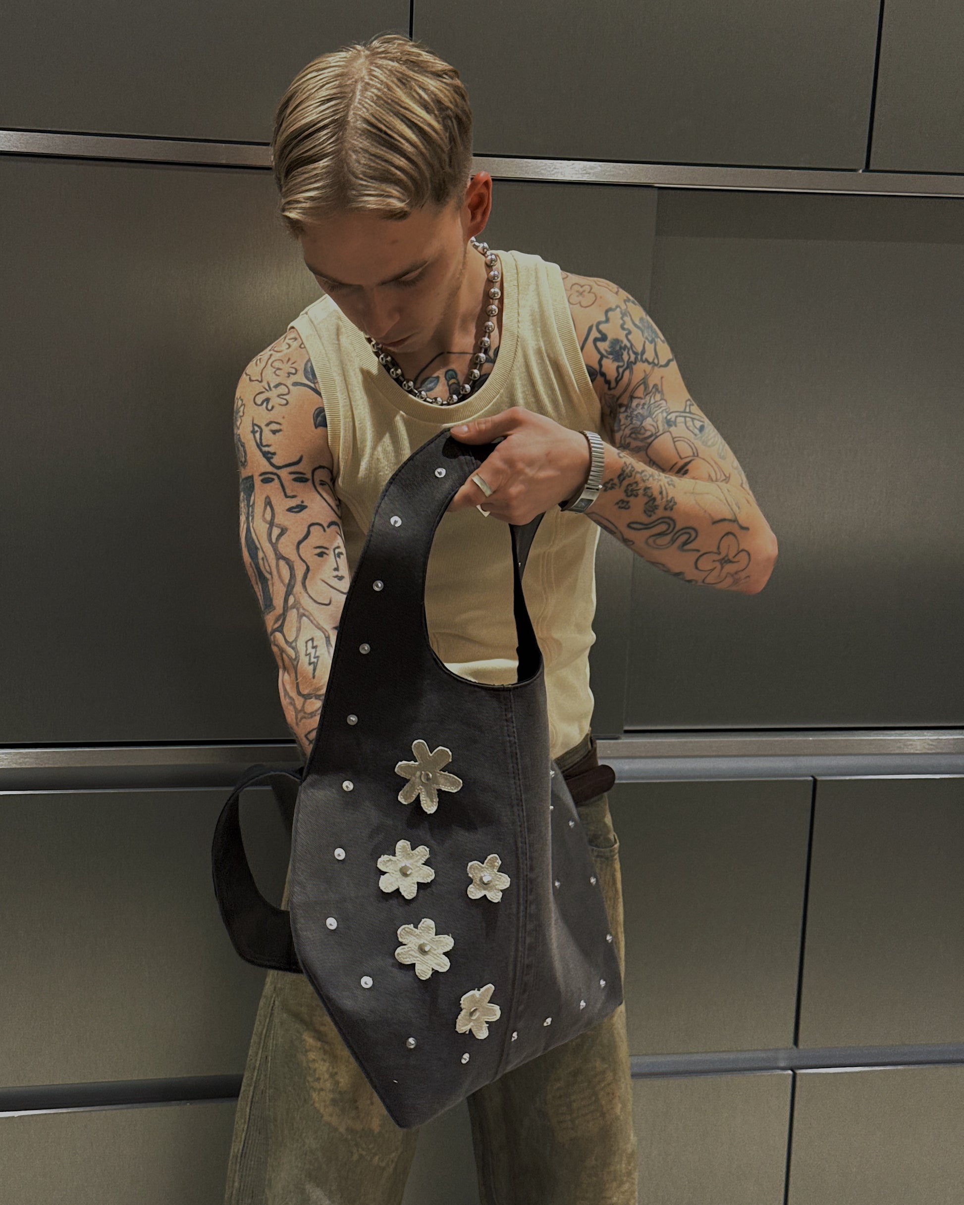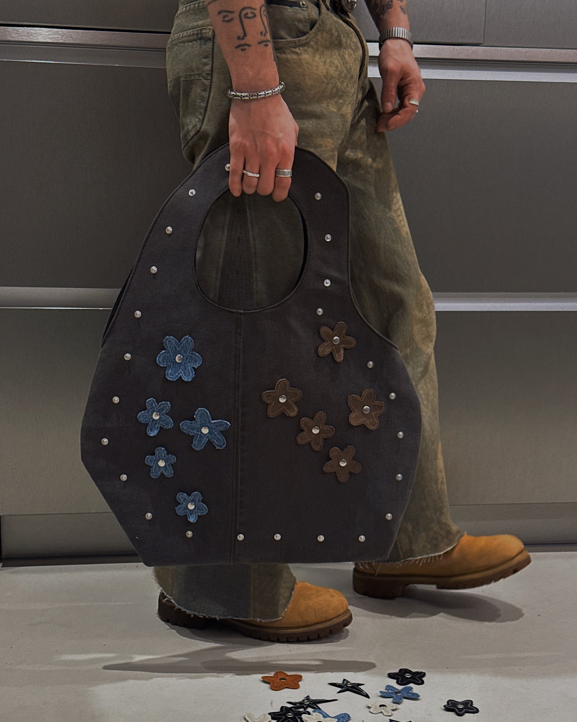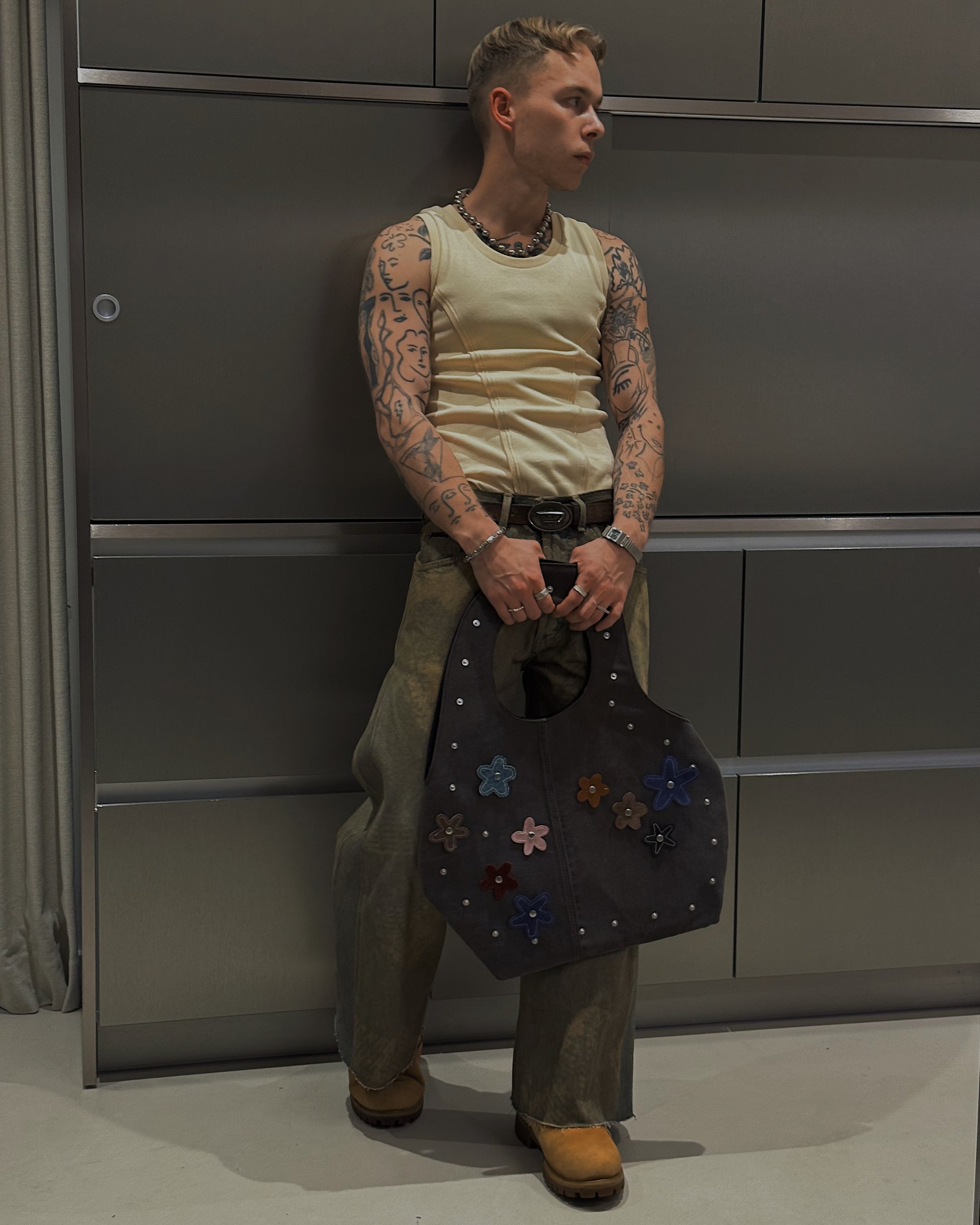 Crafted from reclaimed denim, this sculpted tote brings a refined, minimalist approach to upcycled design. Its smooth, curved silhouette showcases the natural fading and texture of the salvaged jeans, while the structured handle is seamlessly built into the body of the bag for a clean, uninterrupted shape. The attachments can be changed to match with every fit or removed at all. Inside, a contrasting suitingfabric adds a tailored touch and a hidden layer ofcharacter. Lightweight yet durable, this modern essential blends sustainability, craftsmanship, andsoft architectural form.