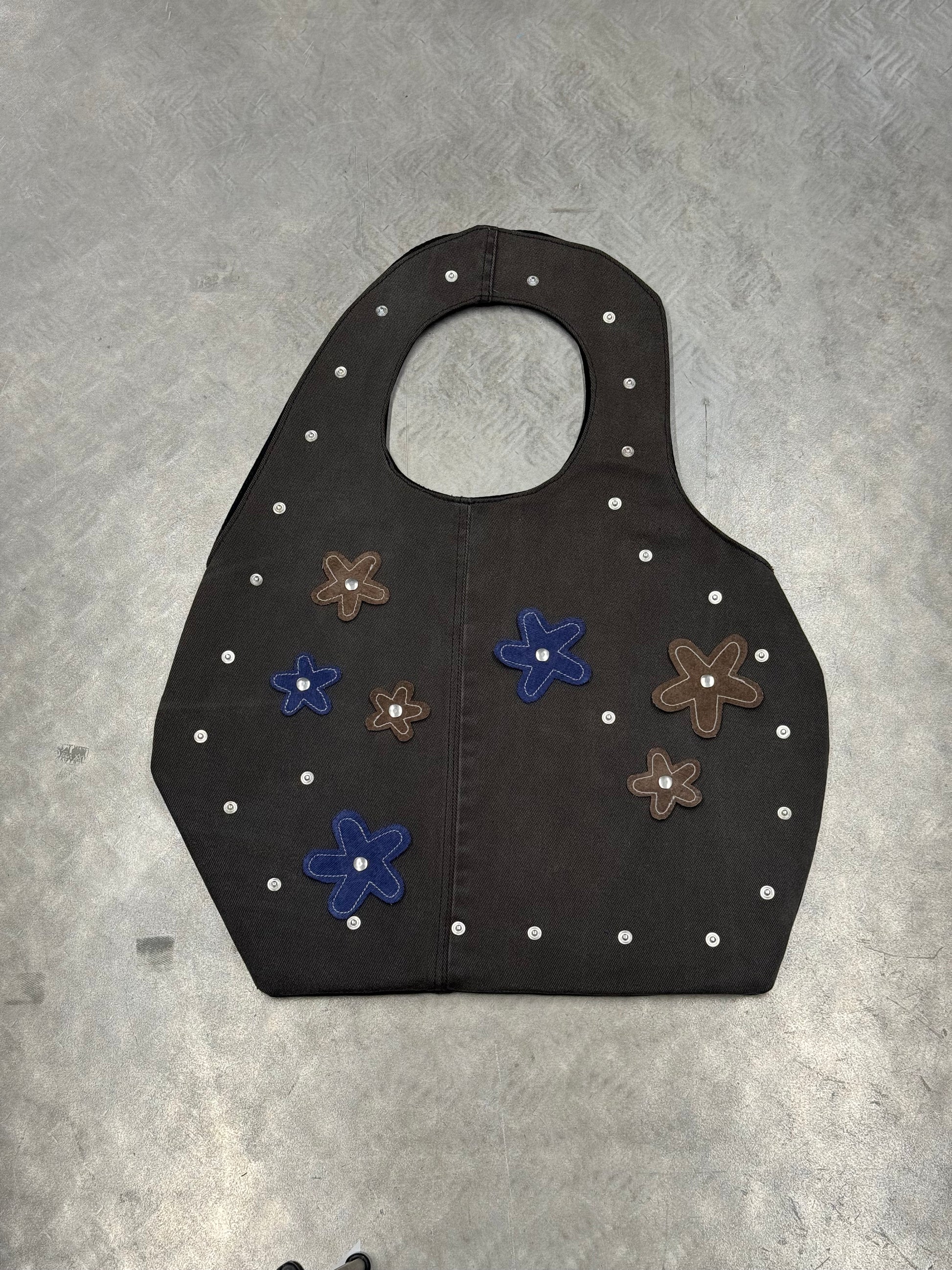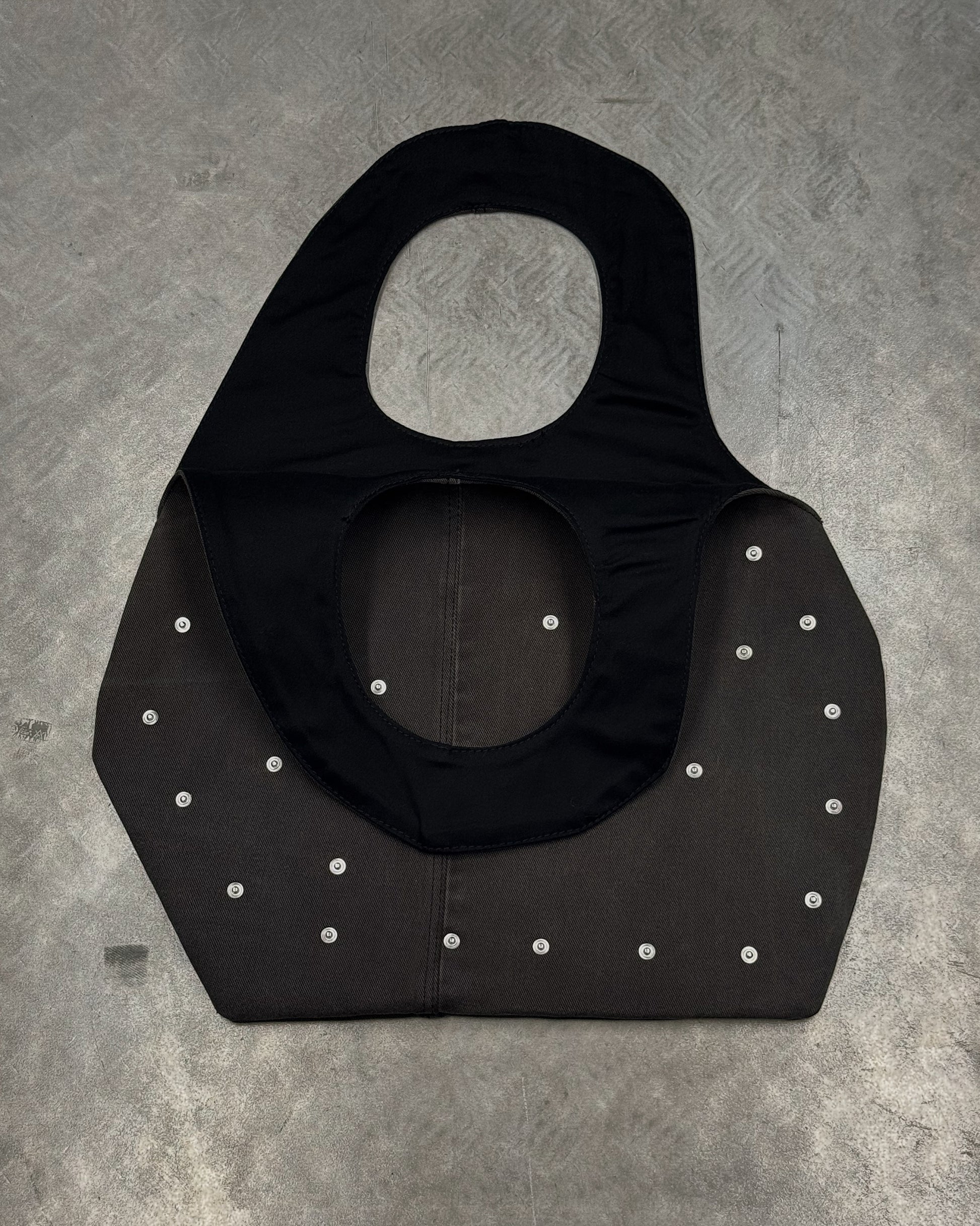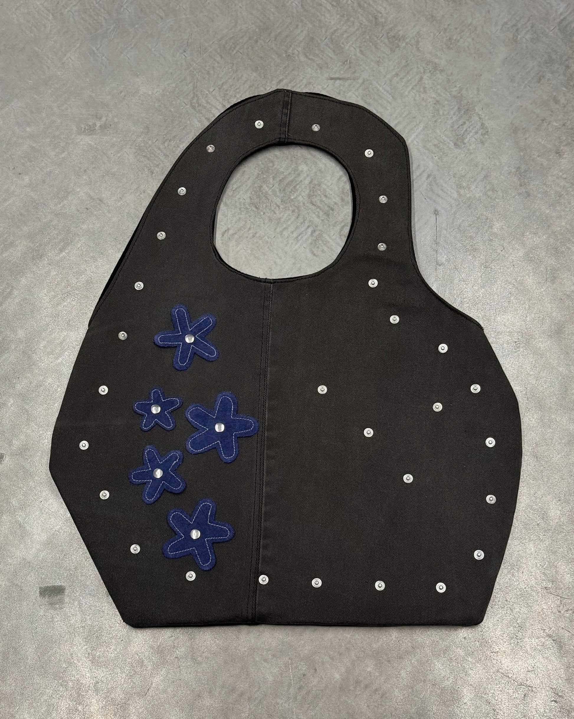 Crafted from reclaimed denim, this sculpted tote brings a refined, minimalist approach to upcycled design. Its smooth, curved silhouette showcases the natural fading and texture of the salvaged jeans, while the structured handle is seamlessly built into the body of the bag for a clean, uninterrupted shape. The attachments can be changed to match with every fit or removed at all. Inside, a contrasting suitingfabric adds a tailored touch and a hidden layer ofcharacter. Lightweight yet durable, this modern essential blends sustainability, craftsmanship, andsoft architectural form.