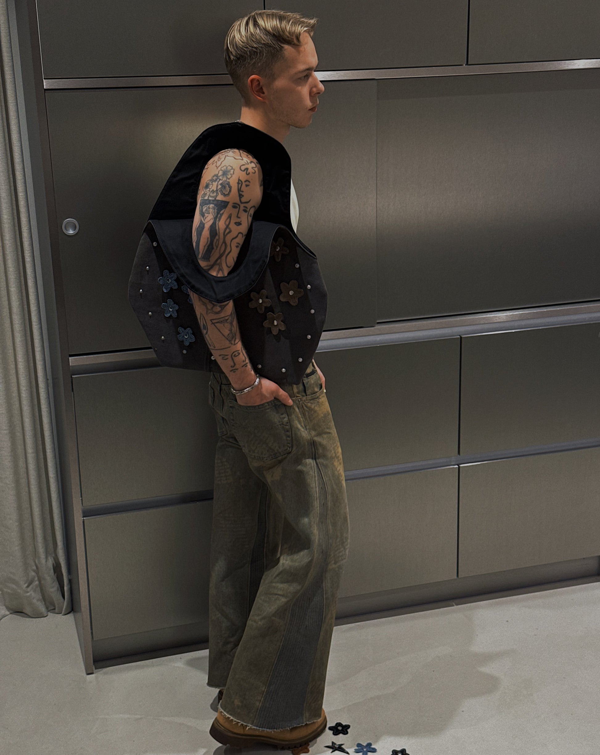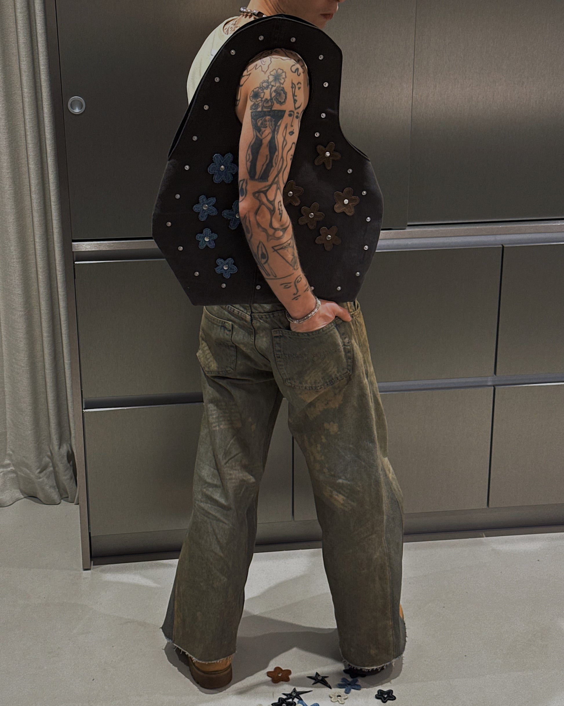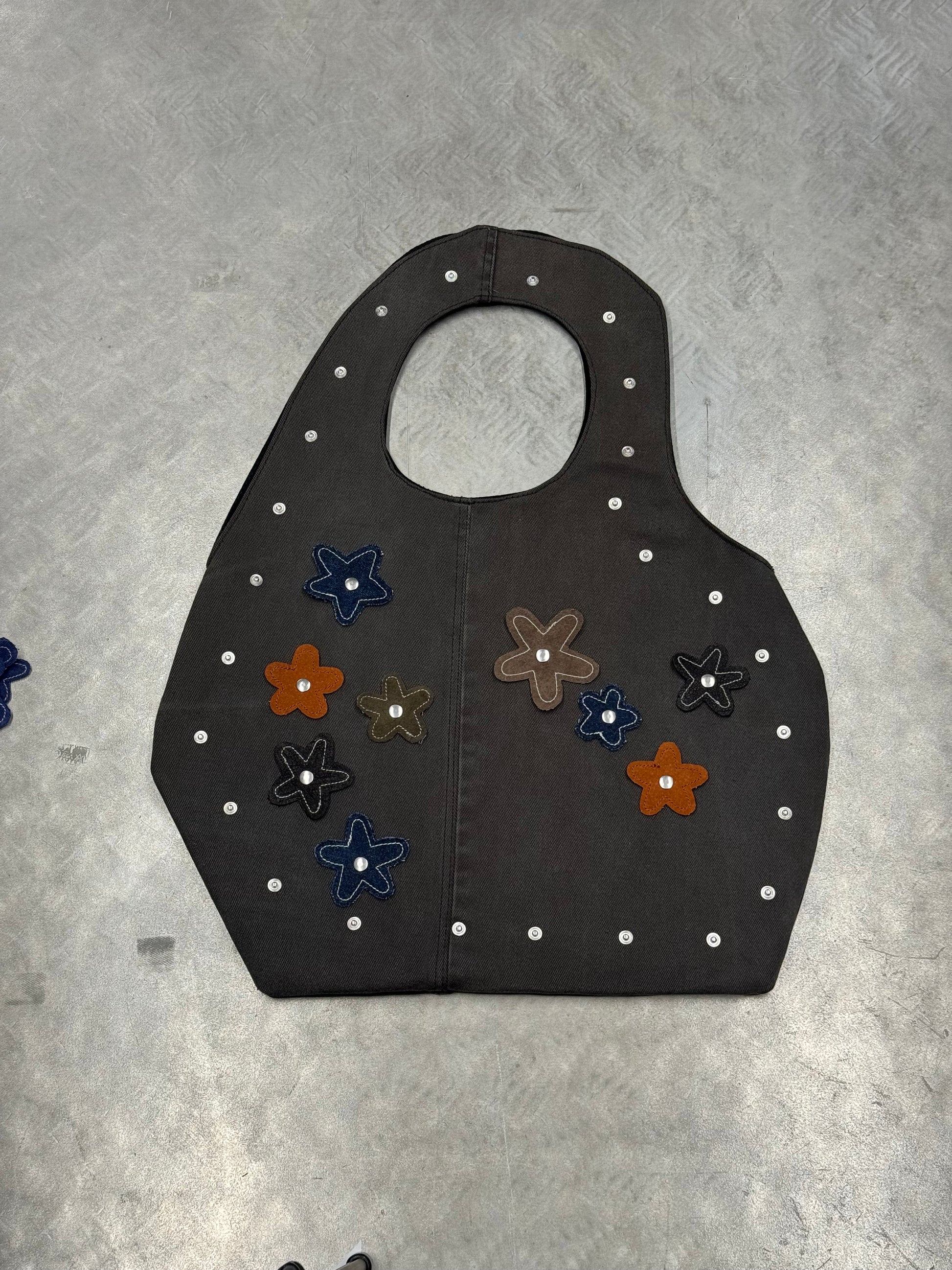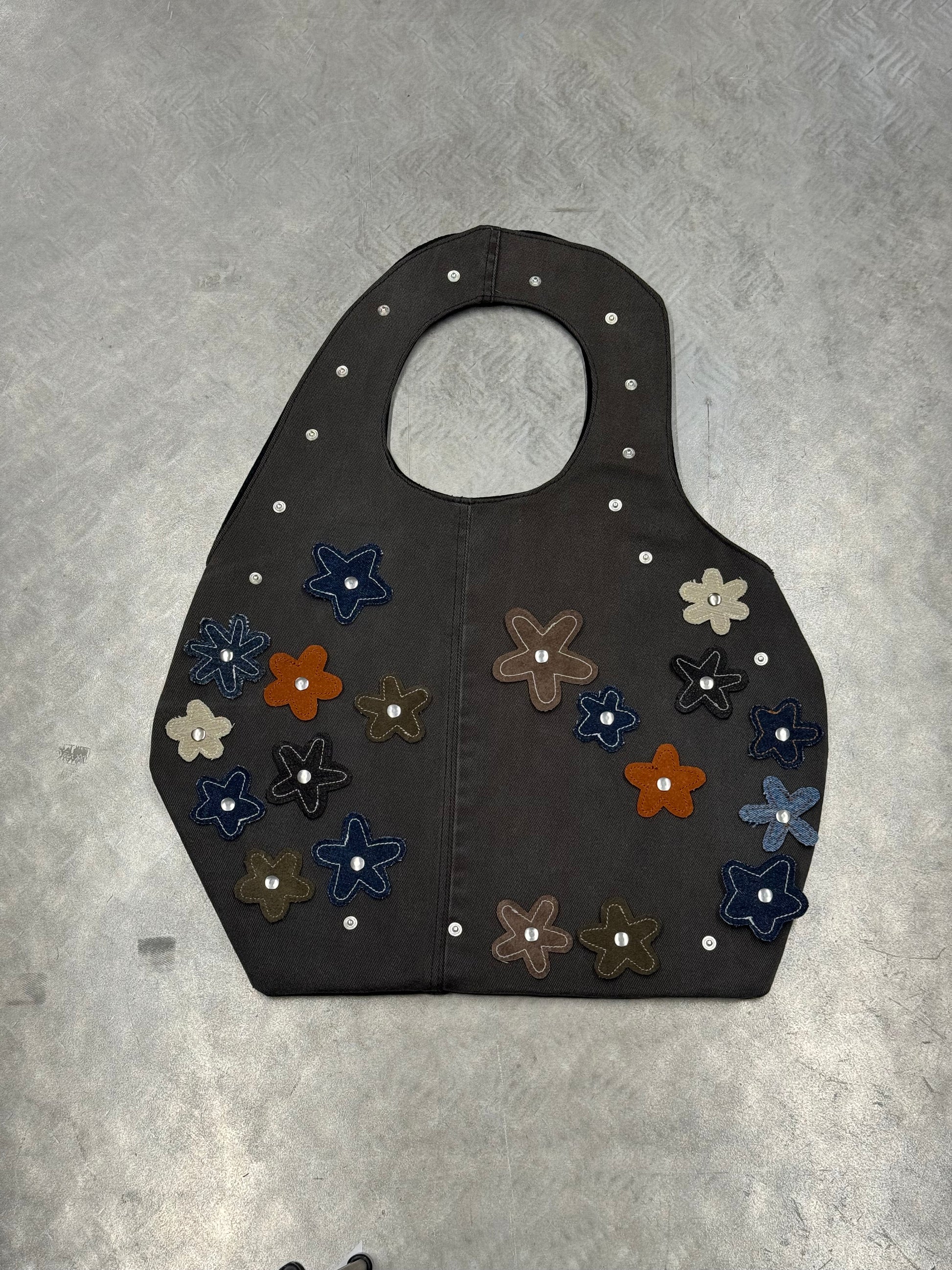 Crafted from reclaimed denim, this sculpted tote brings a refined, minimalist approach to upcycled design. Its smooth, curved silhouette showcases the natural fading and texture of the salvaged jeans, while the structured handle is seamlessly built into the body of the bag for a clean, uninterrupted shape. The attachments can be changed to match with every fit or removed at all. Inside, a contrasting suitingfabric adds a tailored touch and a hidden layer ofcharacter. Lightweight yet durable, this modern essential blends sustainability, craftsmanship, andsoft architectural form.