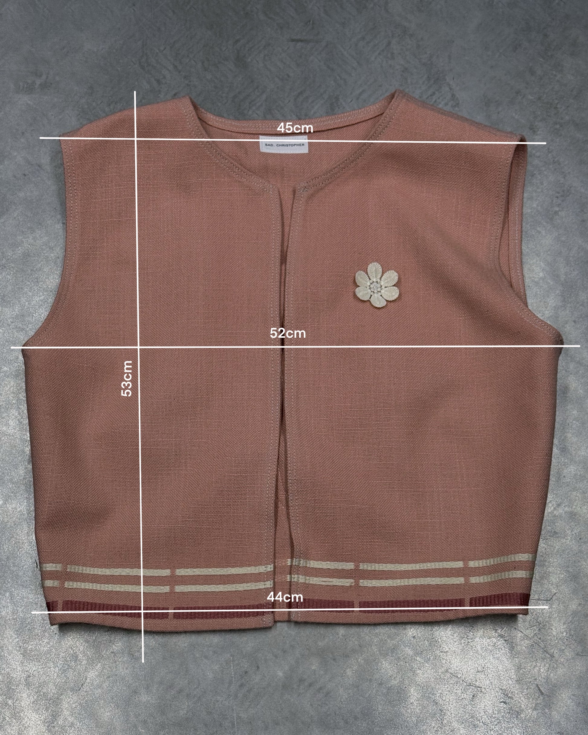 Unique 1/1 vest and belt set. Crafted from reclaimed vintage textile, this vest combines a clean, structured silhouette with playful detail. The back features a bold, hand-embroidered flower motif, creating a standout focal point against the soft peach-toned fabric. Subtle woven stripes along the hem add visual balance, while the open arm design offers an easy, relaxed fit. Combined with the belt it becomes truly unique piece. The placement of the belt is up to your imagination! It is an expressive layering piece made with thoughtful, sustainable craftsmanship.
